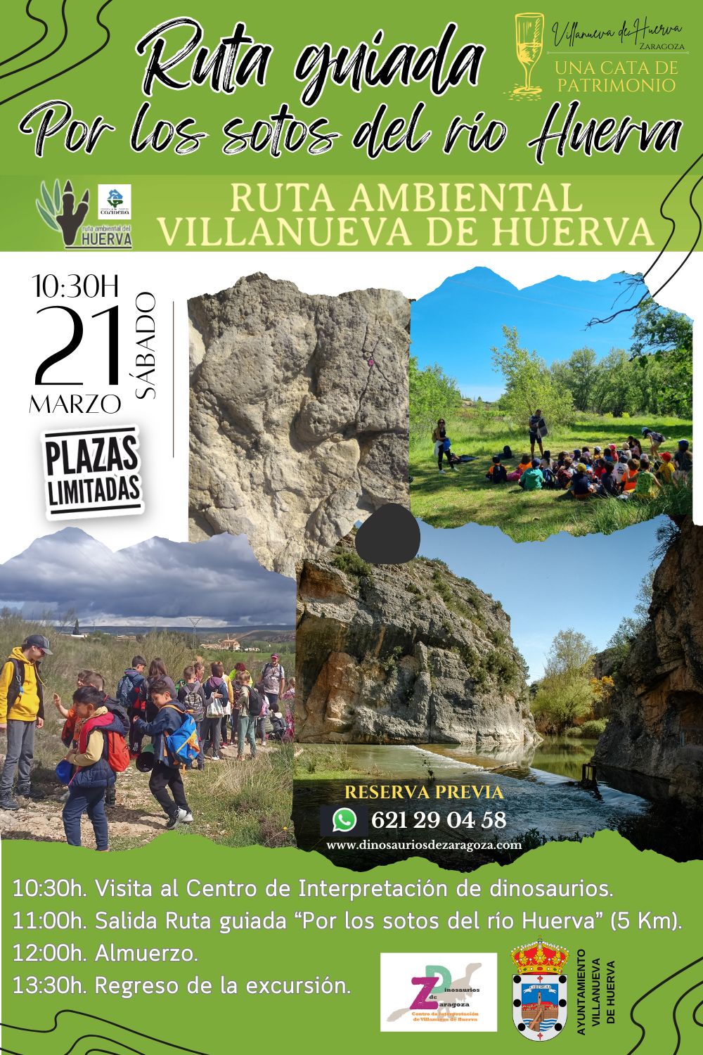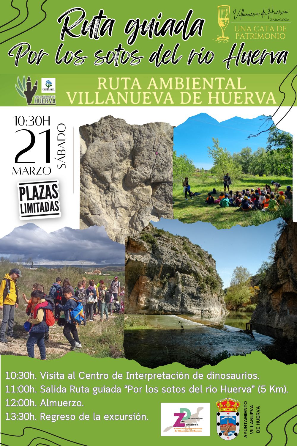 En la ruta guiada Vivir entre dinosaurios visitaremos los yacimientos de huellas fósiles de dinosaurios. Un recorrido de 4 Km. disfrutando de la naturaleza del entorno, pasando por bonitos lugares como la Foz de Los Calderones, la Fuente del Baño y los sotos del río Huerva. Hablaremos de dinosaurios y explicaremos las huellas que dejaron en Villanueva de Huerva hace unos 135 millones de años.