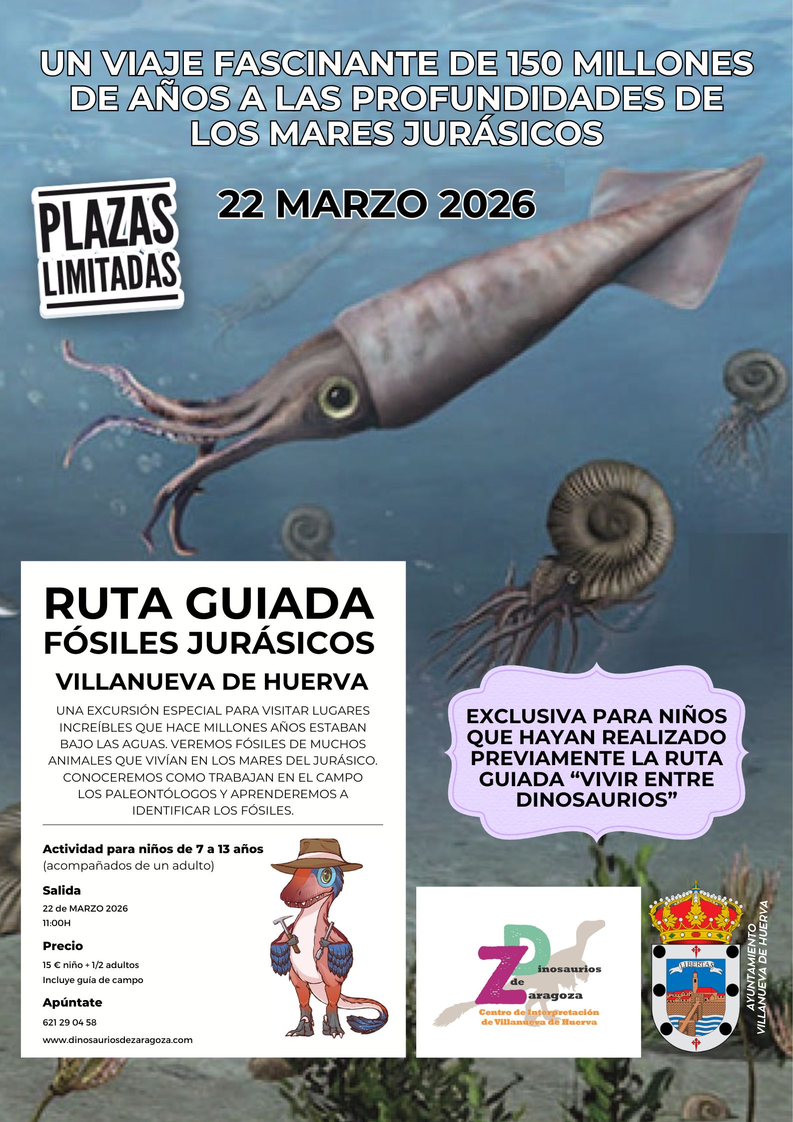 ¿Quieres que tus hijos puedan participar en una excavación y buscar fósiles auténticos? Apúntalos a nuestro Taller de excavación: conocerán cómo trabajan los paleontólogos y realizarán una pequeña excavación que les permitirá encontrar fósiles reales. ¿Habrá alguno de dinosaurio? Pasarán un rato muy divertido y les entregaremos un diploma reconociendo su labor por el patrimonio paleontológico de Villanueva de Huerva.