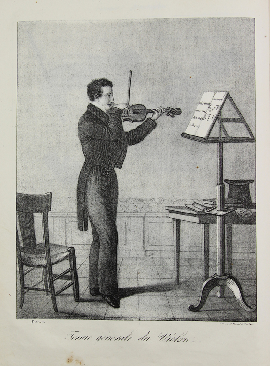 En las primera páginas encontramos una litografía firmada por el pintor barcelonés Francisco Jubany, que llegó a Francia en 1811 como prisionero y donde hizo escuela, especialmente en Lyon. En ella podemos ver la figura retratada de un violinista que muy probablemente sea un miembro de la familia, quizás Francisque. El método comienza enumerando generalidades sobre el violín y continua con diversas lecciones. Incluye Six Sonates pour violon avec accompagnement de basse, Douze Caprices ou Études a violon seul y dos series de Six Duos pour deux violons. De estos últimos, hemos elegido para el mini concierto de hoy una serie de piezas que se han agrupado en tres breves bloques de tres movimientos, el primero, y de dos el resto. Se trata de obras de estilo clásico, influenciadas por los gustos musicales de la época. La función pedagógica de estas composiciones resulta fundamental para el progreso del joven aprendiz de violín.