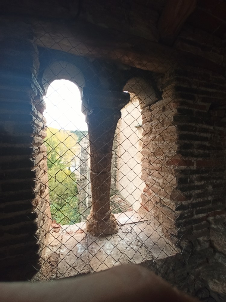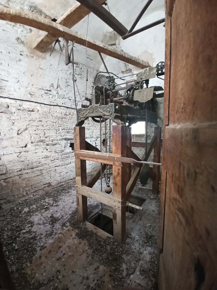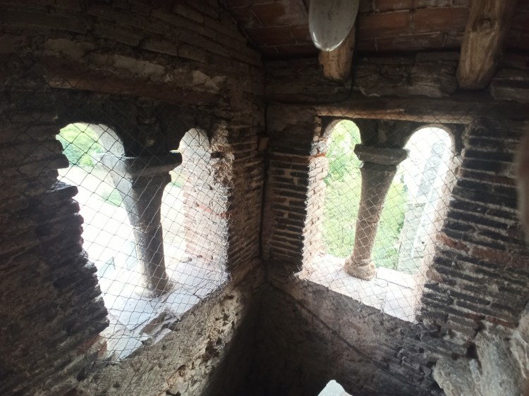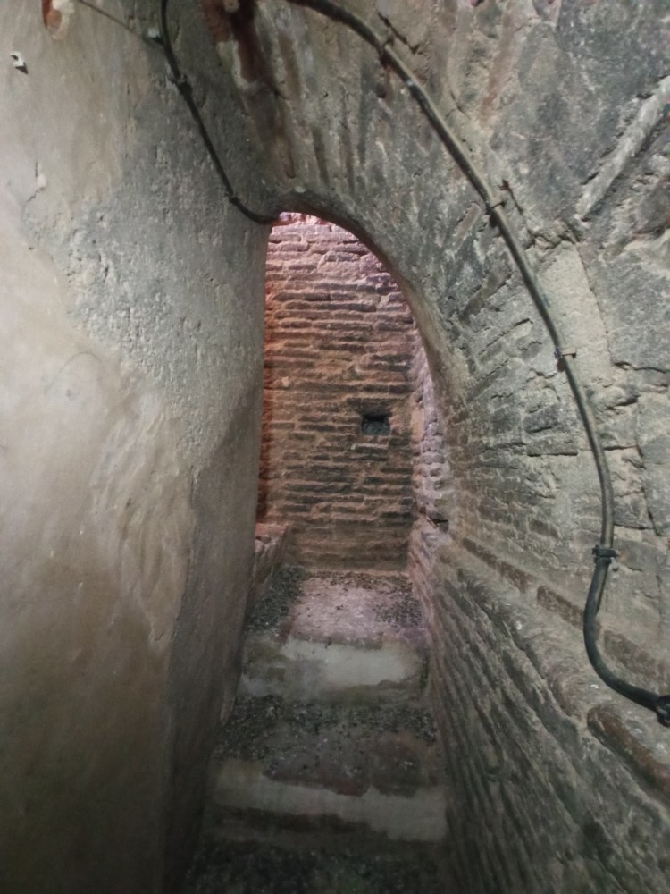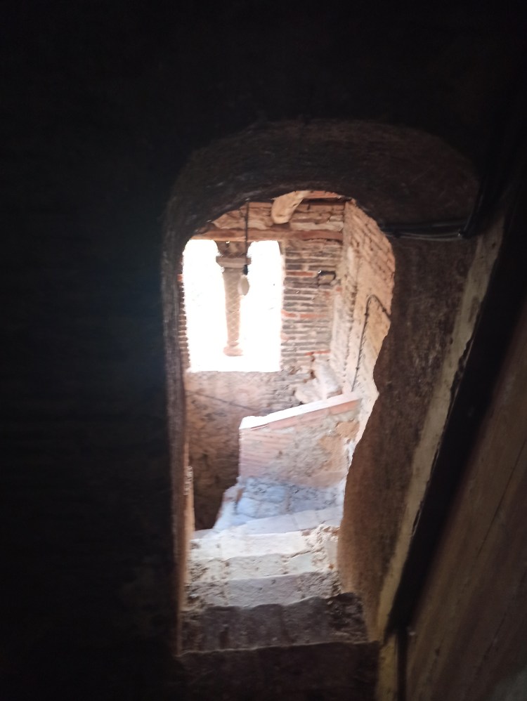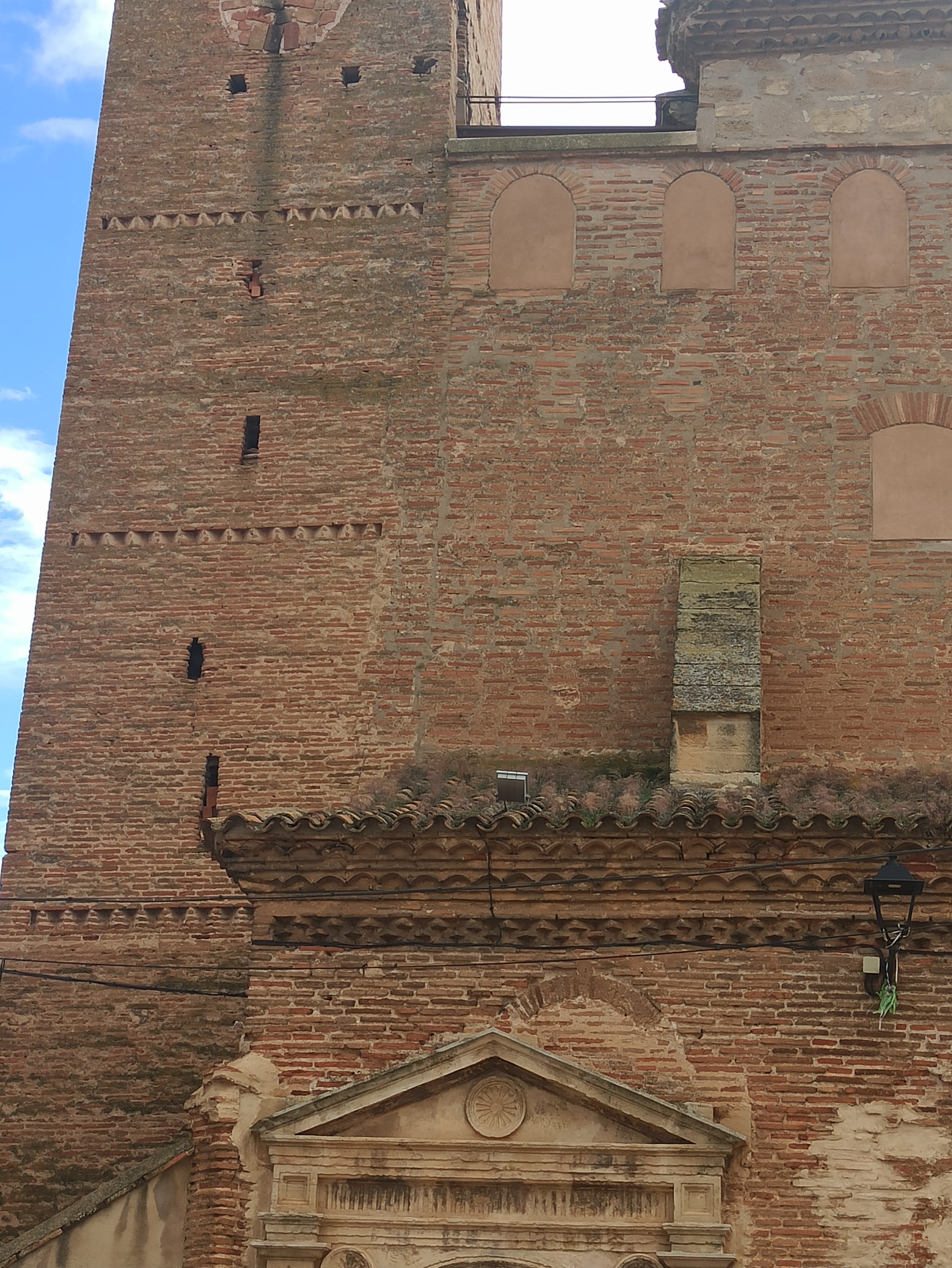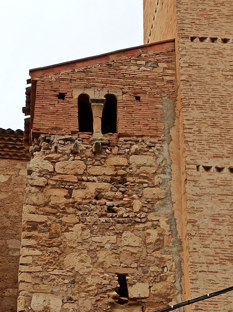 Sobre la torre oculta tras la principal Carbonel nos cuenta lo siguiente: “la torre secundaria que a ella se encuentra adosada contiene la escalera que da acceso a cada una de las plantas, hasta la cuarta estancia, pues termina a esa altura. En ella también se observa que fue levantada a posteriori de la torre principal. Al igual que la iglesia, está hecha de mampostería de piedra, con inclusión de sillares. La parte superior es de fábrica de ladrillo, aunque de diferente factura que la de la torre. Presenta la particularidad de tener sendas ventanas geminadas en las caras NE y NO, en arco de medio punto de piedra sillar, apeando sobre columna con su correspondiente capitel y cimacio, también de piedra, de origen románico. Ante la falta de documentación, pensaremos que estas piezas fueran recuperadas de otra edificación del siglo XII y reaprovechadas aquí, si damos por cierto que esta torre auxiliar fue erigida en el siglo XVI, pero no hay ningún motivo para descartar que fuera construida en ese siglo XII y que, por tanto, esas piezas sean originarias ya de ese lugar. De cualquier forma, de lo que no hay duda es de que es posterior a la torre de ladrillo que nos ocupa. En su interior, la escalera es de caracol, construida en torno a un machón central. El acceso a cada planta se realiza a través de huecos de ladrillo ligeramente apuntados, lo que también nos lleva a otra época anterior al Renacimiento. Las bóvedas de medio cañón fueron rotas en su día para pasar las cuerdas de las campanas, pero también se ven en un rincón pequeños huecos para la comunicación entre plantas mediante escaleras de palo antes de adosarle la torre secundaria. Para acceder a las dos plantas superiores tenía el mismo sistema, pero se cambió en algún momento rompiendo la estructura primitiva y construyendo las escaleras actuales de fábrica, posiblemente en el siglo XVI”.