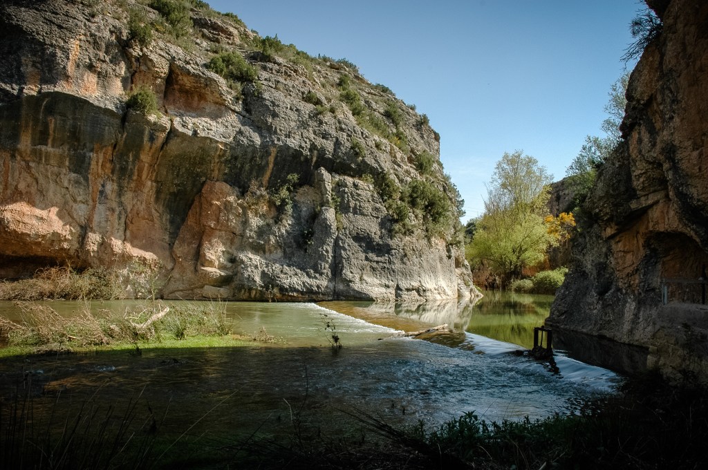 Encauzado por angostos estrechos después de Vistabella, y perdido en el verano su caudal inicial, puede decirse que no resurge como río continuo más que cerca ya de la terminación de aquéllos, en la llamada fuente del Pez. Ligeramente se abre el cauce en las fincas de Los Santos y de Las Torcas. Aguas abajo del molino de este nombre, por un estrecho portillo igualmente denominado, entra en una tajada hoz como de unos dos kilómetros, la salida de la cual se verifica por el nuevo portillo de Peña Tajada, a partir del cual se abre la vega de Tosos, junto a cuya linde izquierda se encuentra situado el pueblo.
