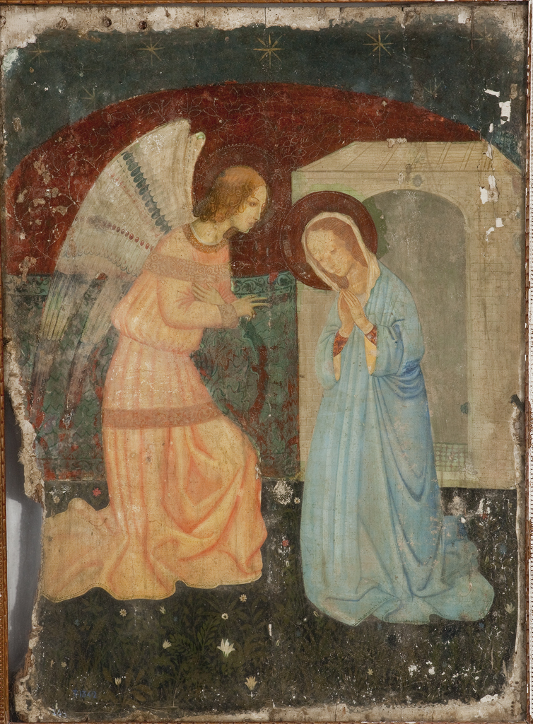 La Anunciación. El ángel Gabriel en actitud de arrodillarse, se dirige a María, quien interrumpe su plegaria para escuchar la salutación angélica. Donativo de doña Trinidad Scholtz, viuda de Iturbe, aceptado por Real orden de 11 de Abril de 1911. Probablemente es obra de un pintor español del primer tercio del siglo XV, educado en Toscana bajo la influencia de Beato Angelico. Procede de una iglesia de Villanueva del Huerva, partido judicial de Belchite (Zaragoza). Torpemente restaurada en algunas partes. Alto 1´27, ancho 0´98. T.
