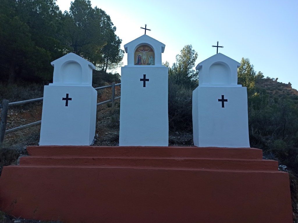Las estaciones del vía crucis se encuentran en un recorrido de 14 peirones, con hornacinas adornadas de cerámicas que representan cada una de las escenas, y rematados por una cruz sobre un tejadillo piramidal. La estación XII (la crucifixión) se destaca con un triple peirón denominado triduo o Gólgata que representan las tres cruces del original monte Calvario.