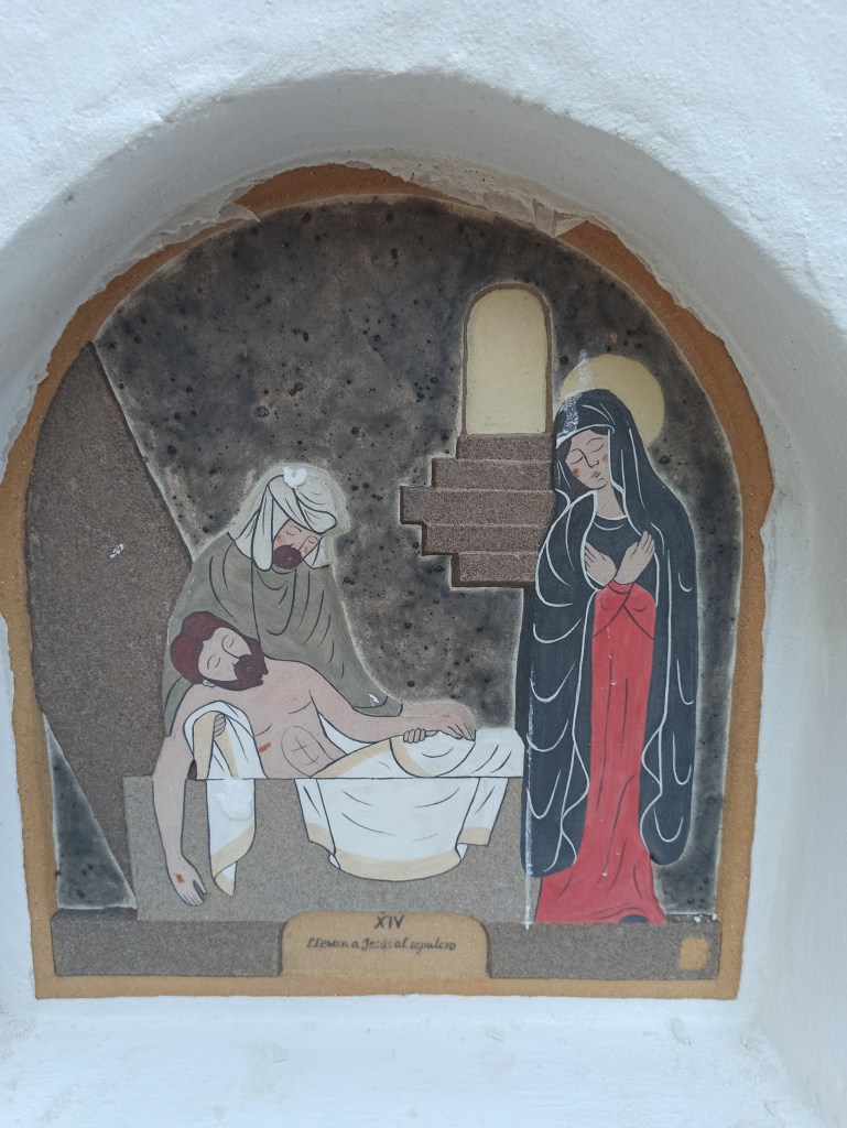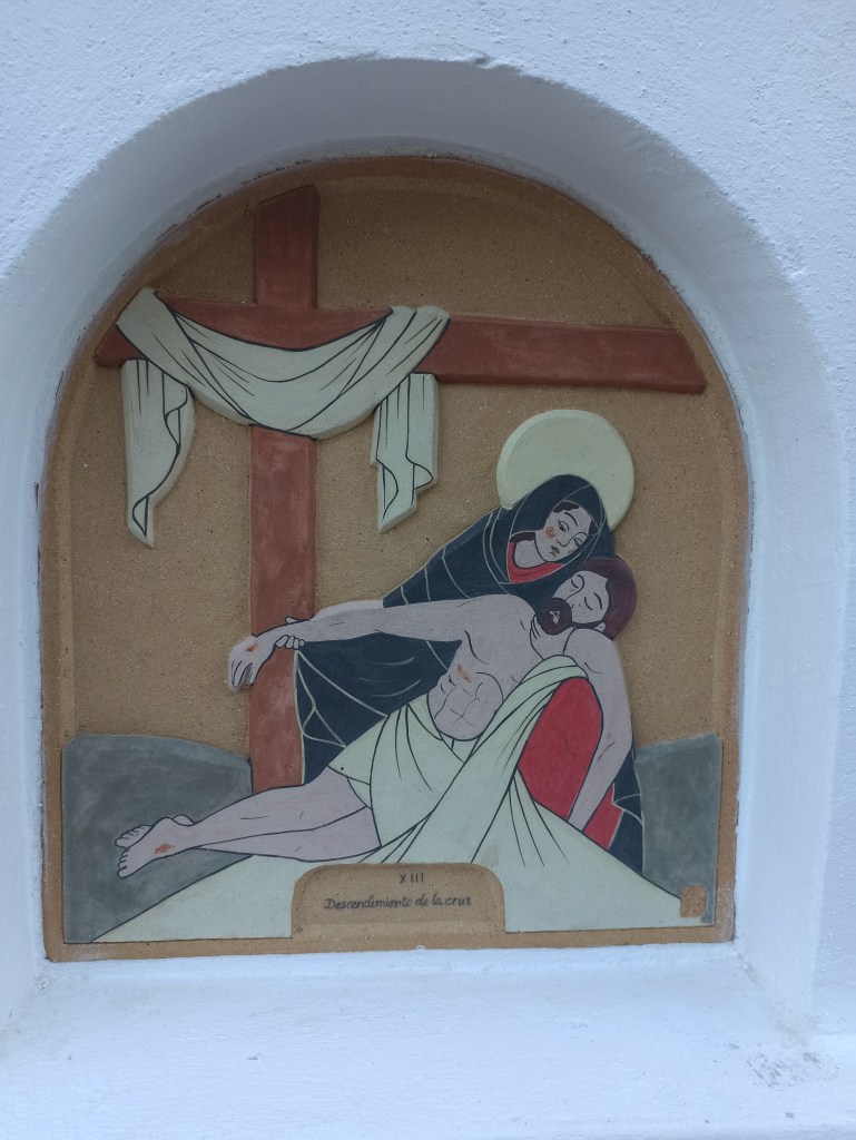 La expresión latina vía crucis significa literalmente “camino de la cruz”, es decir, el que Jesucristo recorrió cargado con la cruz hasta el monte Calvario, donde fue crucificado. Catorce son las escenas que se representan en él: Jesús es condenado a muerte (I), Jesús con la cruz a cuestas (II), Jesús cae por primera vez (III), Jesús se encuentra con su madre María la Virgen (IV), Simón de Cirene ayuda a Jesús a llevar la cruz (V), La Verónica limpia el rostro de Jesús (VI), Jesús cae por segunda vez (VII), Jesús consuela a las piadosas mujeres que lloran por él (VIII), Jesús cae por tercera vez (IX), Despojan a Jesús de sus vestidos (X), Clavan a Jesús en la cruz (XI), Jesús muere en la cruz (XII), Descienden a Jesús de la cruz y su madre lo recibe en su regazo (XIII) y Sepultura de Jesús (XIV).