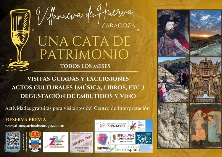 El último sábado de cada mes celebramos Una cata de patrimonio en Villanueva de Huerva. Un día especial en el que realizamos excursiones, visitas guiadas, actos culturales, degustación de embutidos tradicionales, etc. La participación en las mismas es gratuita para todos las personas que ya han estado con nosotros anteriormente, realizado la ruta guiada «Vivir entre dinosaurios» y visitando el Centro de Interpretación (tarifa de 5€ para el resto).